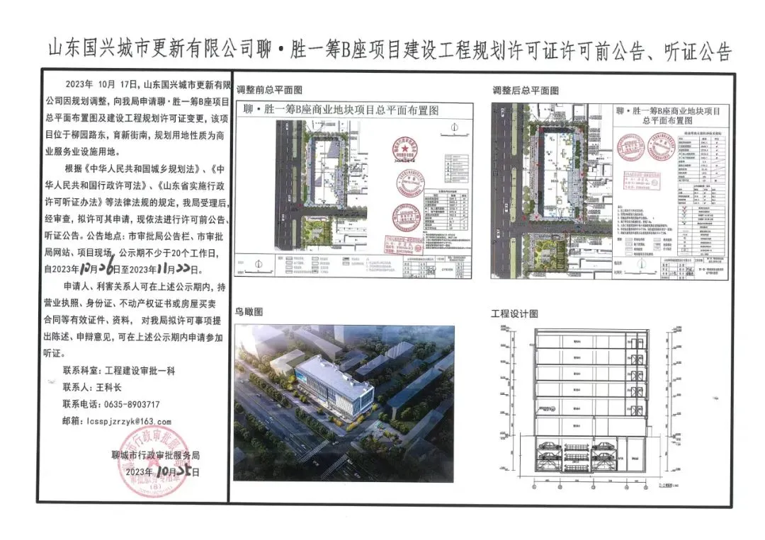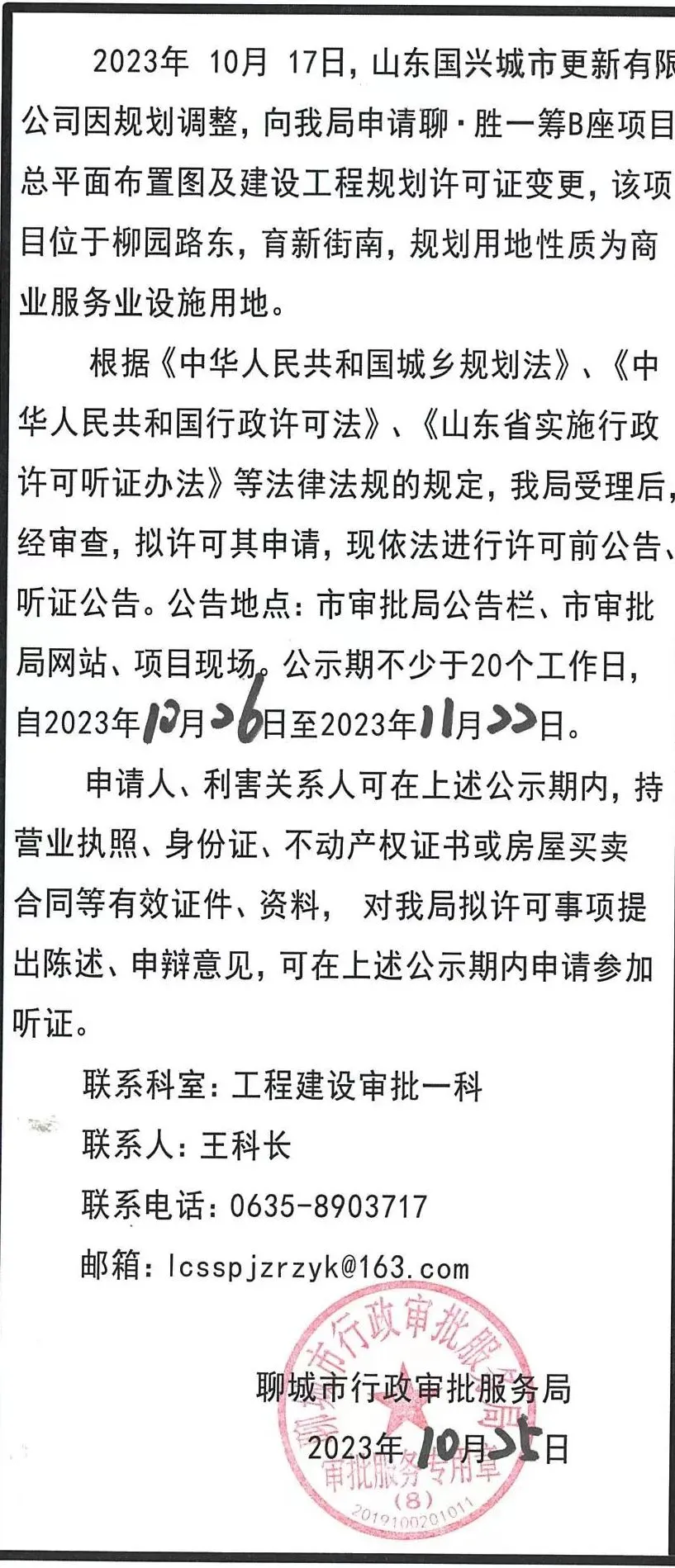 关于山东国兴城市更新有限公司的聊·胜一筹b座变更的许可前公告、听证公告