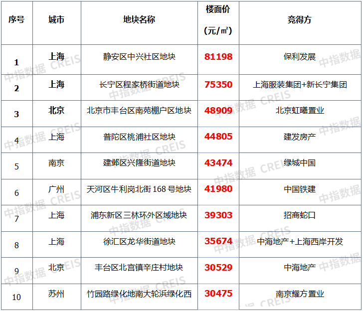 ▍宅地单价top10:榜单同比上升,上海静安区宅地领衔