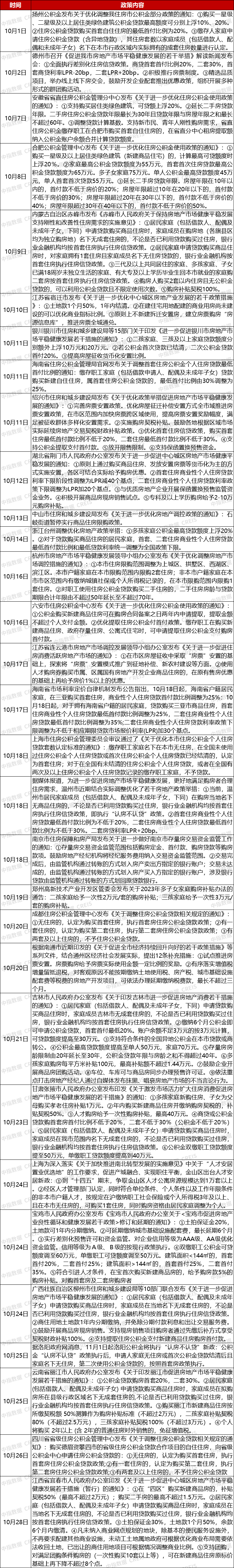 10月,自然资源部明确城镇开发边界外不得进行城镇集中建设,不得规划城镇居住用地。央行支持银行更好地实现企业融资和居民信贷成本稳中有降。自然资源部给各省市自然资源主管部门下发文件建议取消土地拍卖中的地价限制、建议取消远郊区容积率1.0限制等。央行行长潘功胜就2022年第四季度以来金融工作情况作报告,强调对房地产市场风险,按照原则,指导各地精准实施差别化住房信贷政策,加大保交楼金融支持力度,一视同仁支持房地产企业合理融资需求,保持房地产融资平稳。