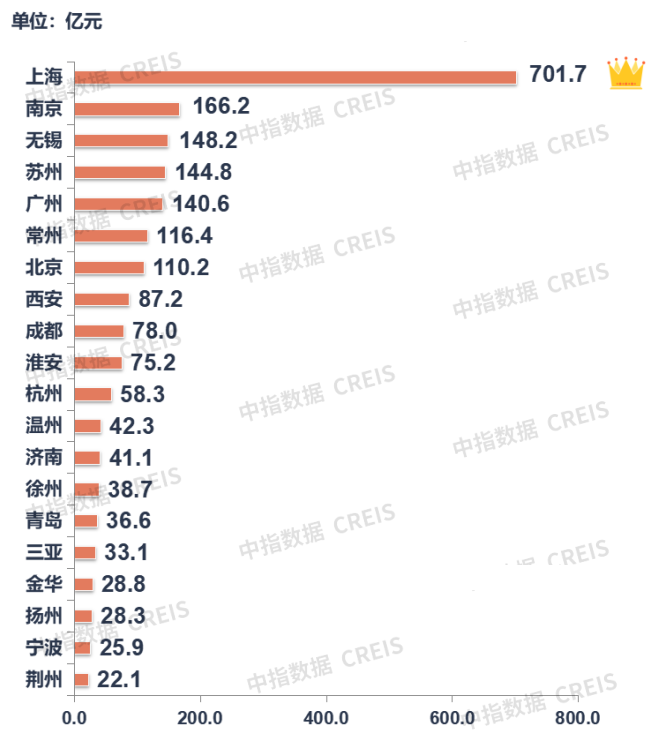 榜单总额同比降逾三成,长三角城市占据榜单十二席。收金占比近五成,且上海收金近702亿领跑榜单。
