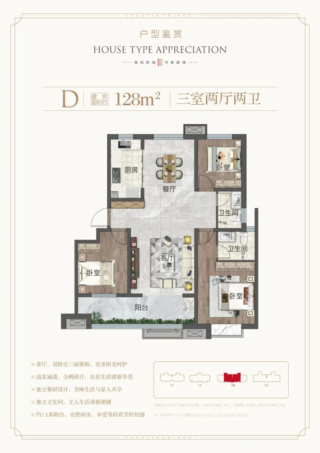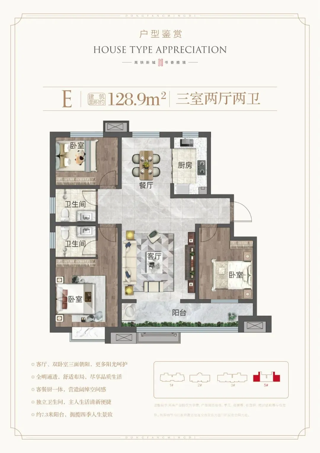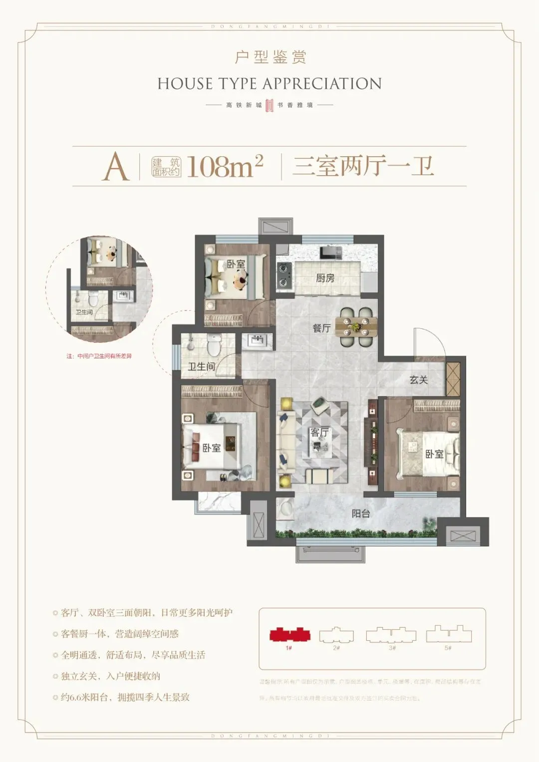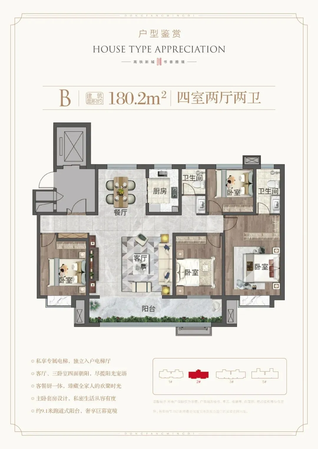 东方名邸为高品质建设高铁新区首个商品房项目1#、3#、5#楼标准层层高3米,2#楼3.15米轩朗层高。全系产品配置三玻两腔low-e断桥铝窗,一线品牌入户门,为提供轩朗静谧的居住空间。