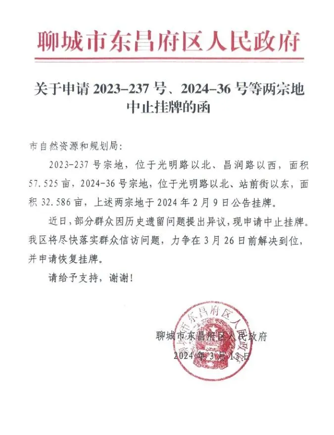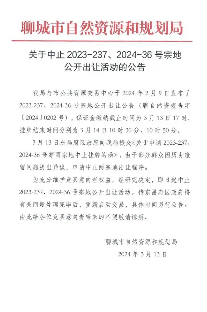 2023-237#、2024-36#由于部分群众因历史遗留问题提出异议,两块中止出让。