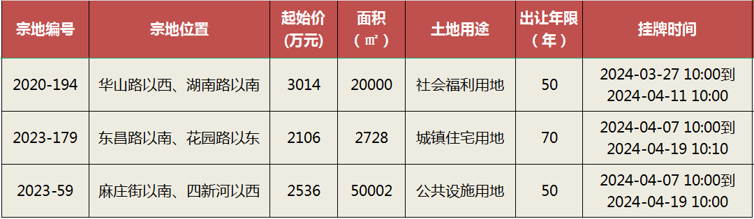 3月聊城市主城区国有发布公告土地共3宗,其中城镇1宗,社会福利用地1宗,公共设施用地1宗。出让面积共计72730㎡,总起始价共7656万元。