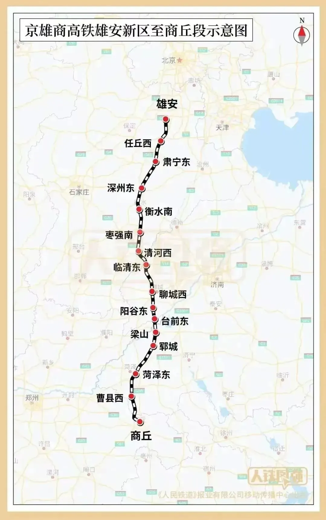 京雄商高铁雄安新区至商丘段北起京雄城际铁路雄安站,经河北省雄安新区、沧州市、衡水市、邢台市,山东省聊城市,河南省濮阳市,山东省济宁市、菏泽市至河南省商丘市,终至商合杭高铁商丘站,设计时速350公里,全长552公里。