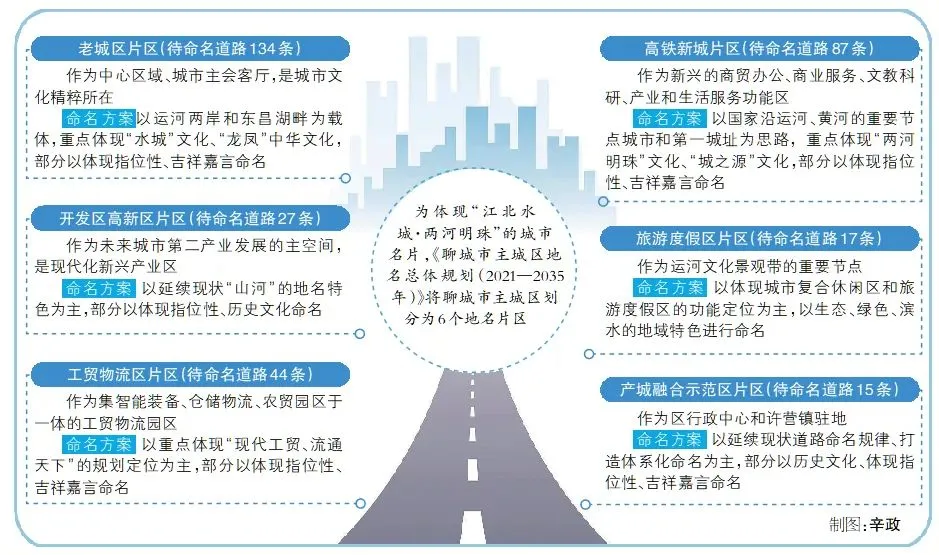 该《规划》主要包含道路、桥梁、轨道交通车站、城市公共空间、建筑物、区、水系七大类地理实体名称。为体现“江北水城·两河明珠”的城市名片,结合《聊城市市辖区道路命名工作规范》片区划分依据、地理环境以及现状地名分布规律等,《规划》将聊城市主城区划分为老城区片区、开发区高新区片区、工贸物流区片区、高铁新城片区、旅游度假区片区、产城融合示范区片区6个地名片区。