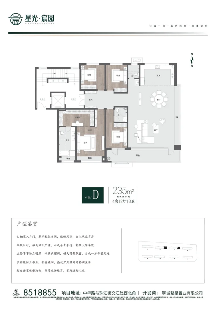 高品质舒居空间,必然以尺度为基础。星光·宸园匠心打造建面约142㎡—235㎡舒阔三居、四居,用阔绰尺度打造每一个空间。双阳光套房、270°、南向大面宽以及大面积玻璃的运用,兼顾实用主义与舒居理念,演绎恰到好处的幸福尺度。更有部分楼座及,打造“女王十字玄关”、约270°环幕观景视野、超大ldkb社交巨厅、浮岛阳台等,引入的设计,营造高奢居住体验,匹配进阶人生。