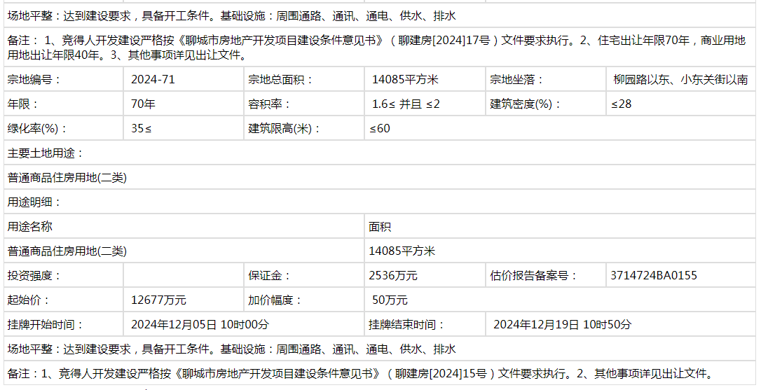 四、本次的详细资料和具体要求,见挂牌出让文件。申请人可于 2024年11月15日 至 2024年12月18日 到 聊城市网站(http://ggzyjy.liaocheng.gov.cn)“电子交易系统-新”土地交易入口 获取 挂牌出让 文件。