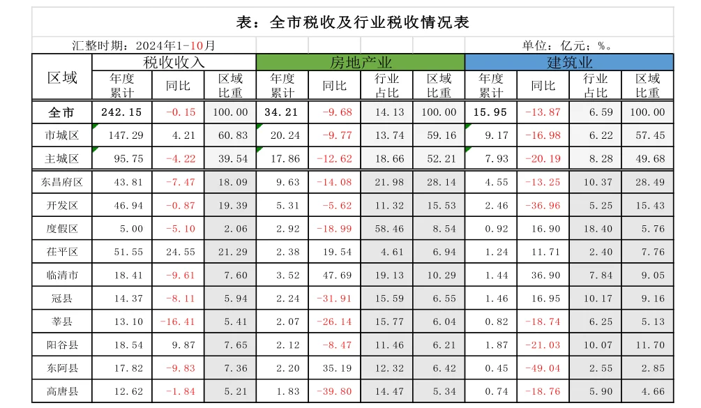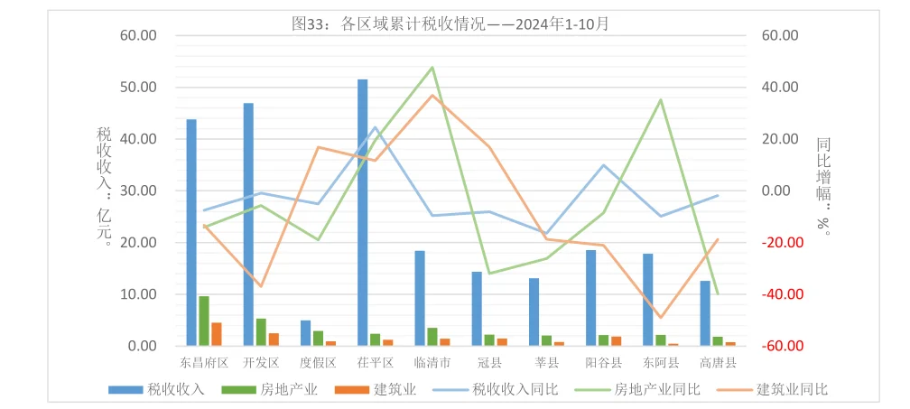 (三)区域税收增减互现。(1)年度累计,东昌府区(9.63亿元)居前;高唐(1.83亿元)靠后。(2)同比增幅,3个增长,7个下降。临清(48%)东阿(35%)增幅居前;冠县(-32%)